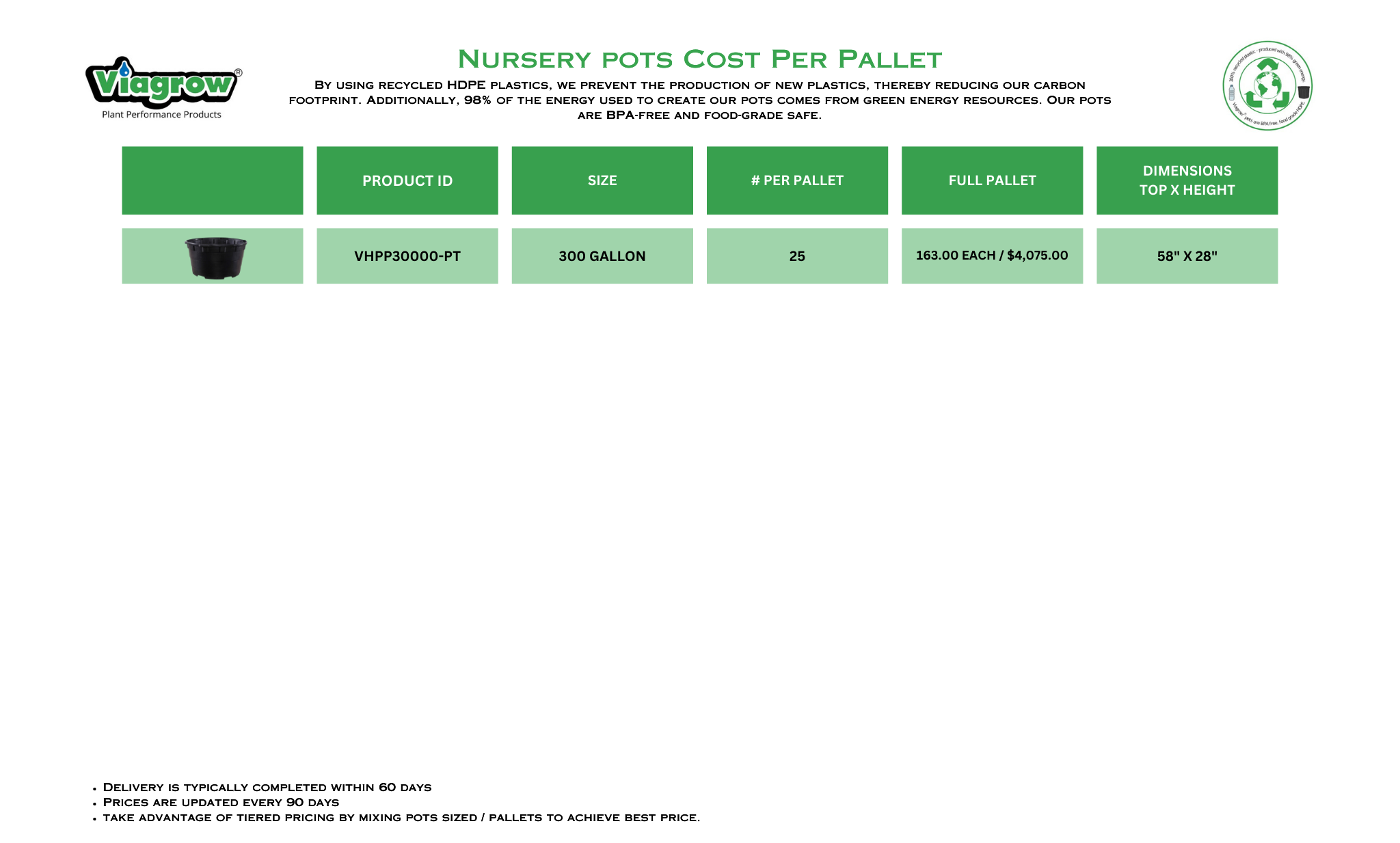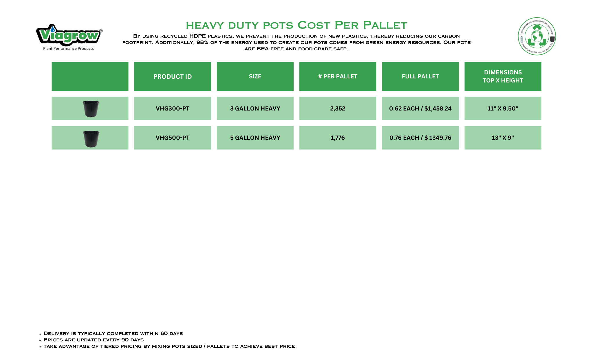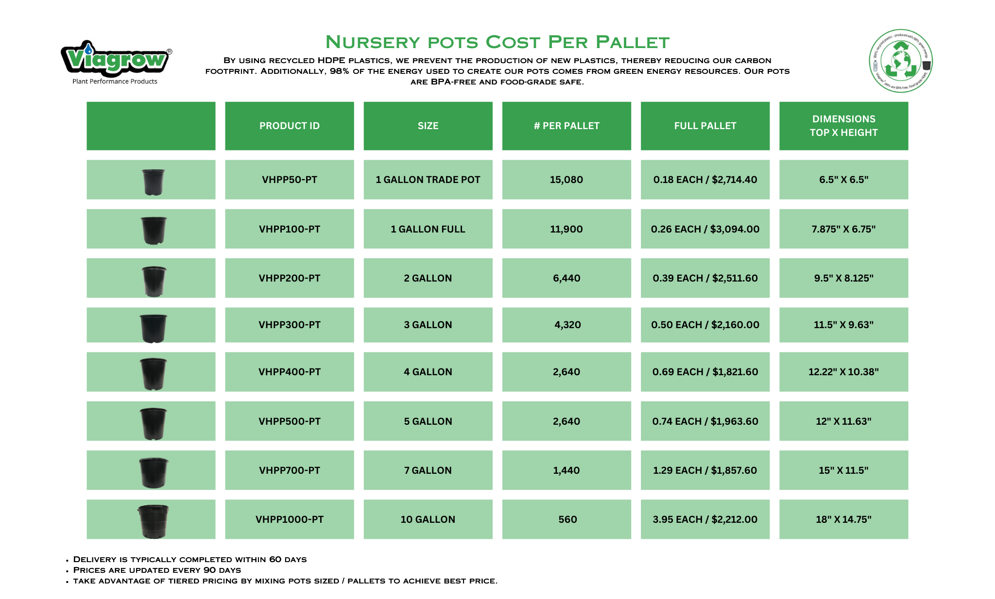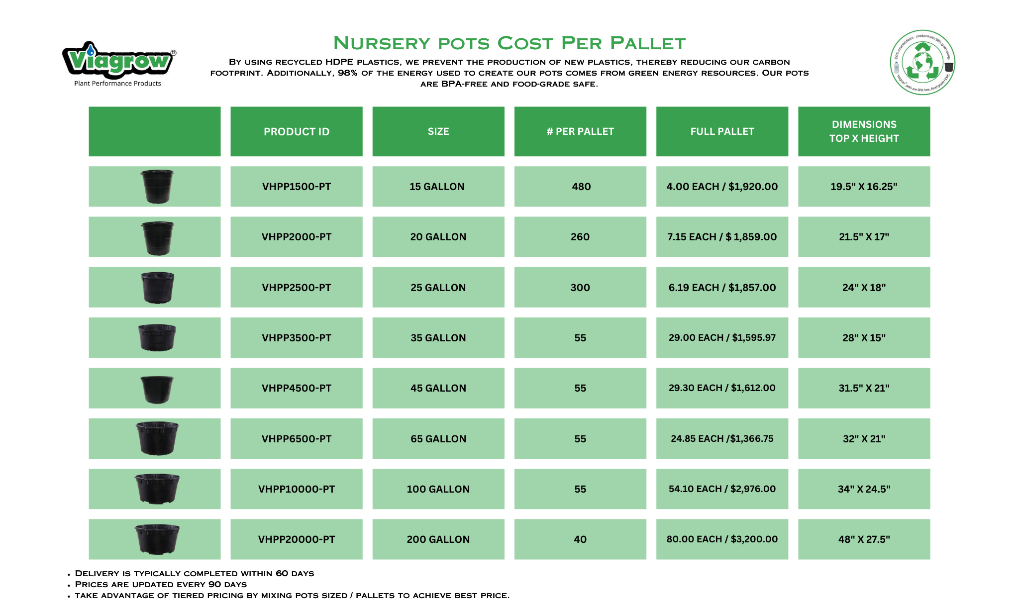 By using recycled HDPE plastics, we prevent the production of new plastics, thereby reducing our carbon footprint. Additionally, 98% of the energy used to create our pots comes from green energy resources. Our pots are BPA-free and food-grade safe.